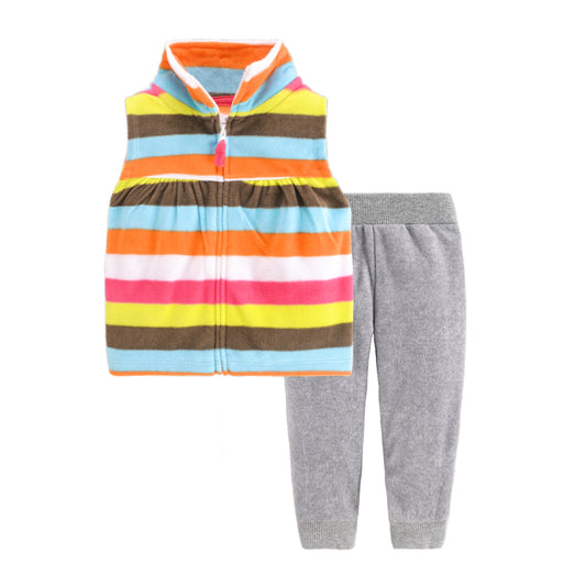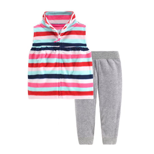 Set de 2 piezas micropolar "Rayado": Pantalón y Chaleco Rosa y Celeste